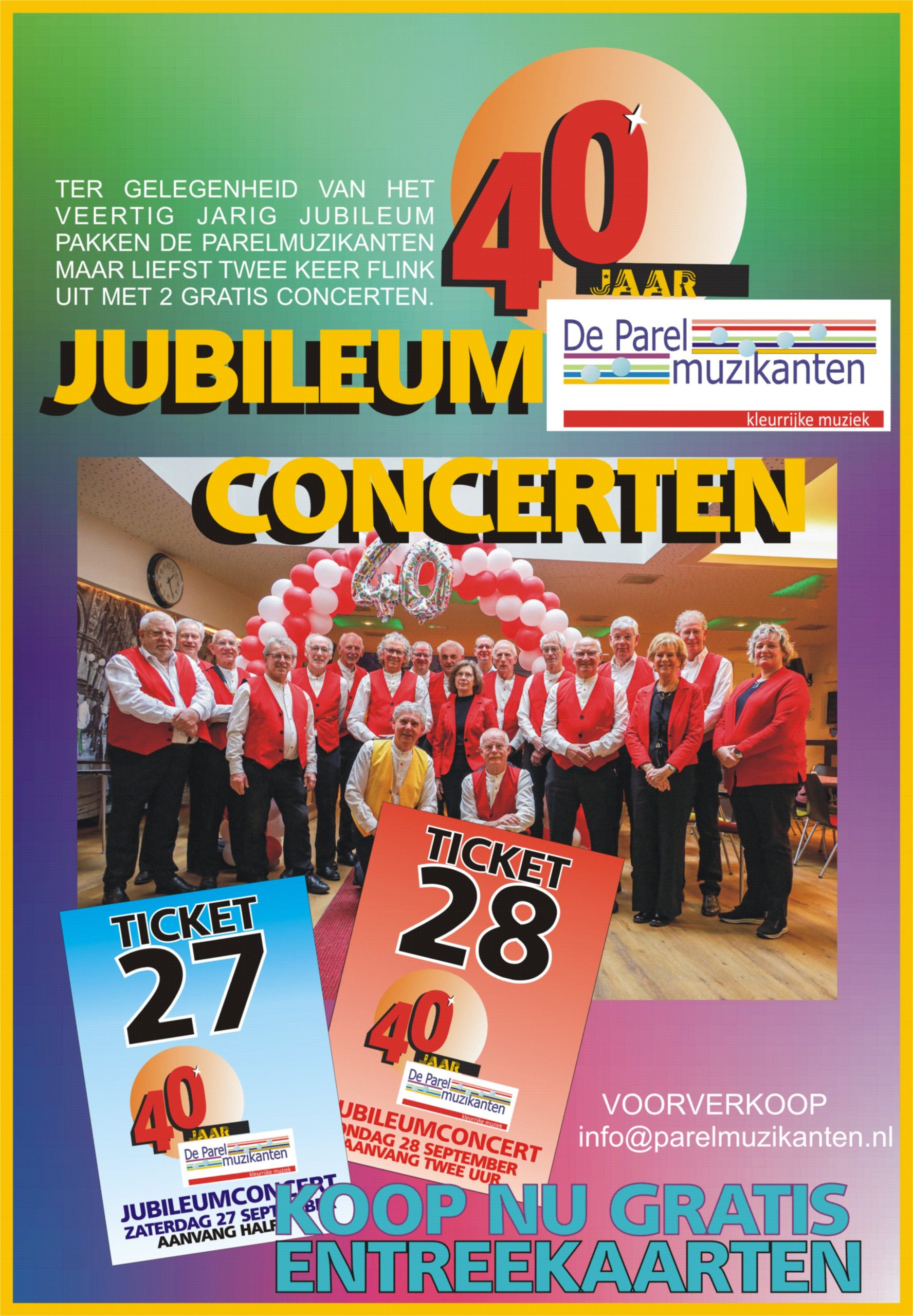 De Parelmuzikanten sluiten het jubileumjaar af met een spetterende muzikale show. De jubileumconcerten vinden plaats op zaterdagavond 27 september en zondagmiddag 28 september. Beide concerten vinden plaats in Den Boogaard in Moergestel. Natuurlijk hebben we voor deze feestelijke afsluiting voor elke bezoeker een gratis entreekaartje. Maar die moet je dan wel hebben als je er bij aanwezig wilt zijn. De gratis entreekaartjes kun je “kopen” bij de verschillende voorverkoopadressen en bij de muzikanten. We zijn op tijd begonnen met de verspreiding en de zalen zitten al aardig vol, maar er zijn nog een aantal kaartjes in de aanbieding. En vol is vol.